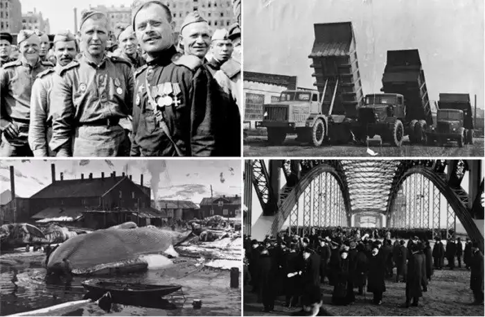 25. Демобилизованные воины, прибывшие в Ленинград с одним из первых эшелонов. Справа участник трех войн Ф.Г. Вадюхин. 12 июля 1945 года.
