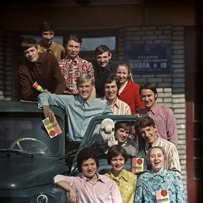 7. Группа учащихся школы, которые после сдачи экзаменов получат водительское удостоверение шоферов, 1974 год.
