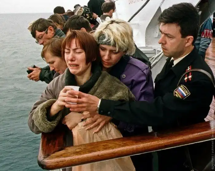 12. Родственники моряков «Курска» на месте гибели подлодки. Баренцево море. Россия. 2000 г.