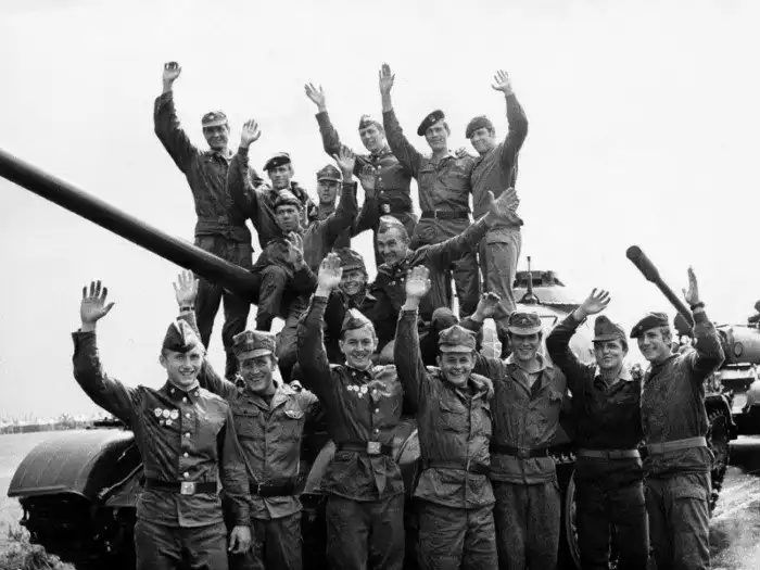 38. Советские, чехословацкие, венгерские и восточногерманские солдаты позируют для фото после совместных военных учений. 1970-е