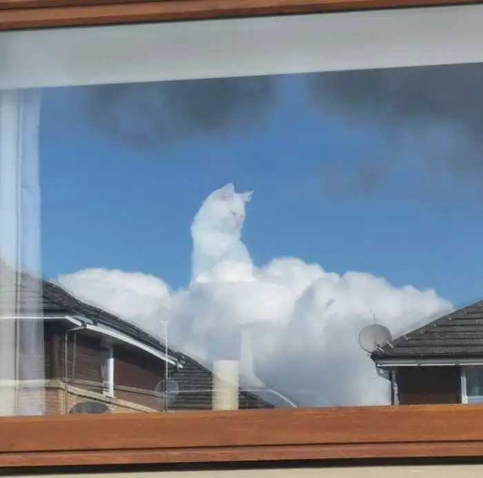 Кошка отражается в окне так, словно сидит на облаке