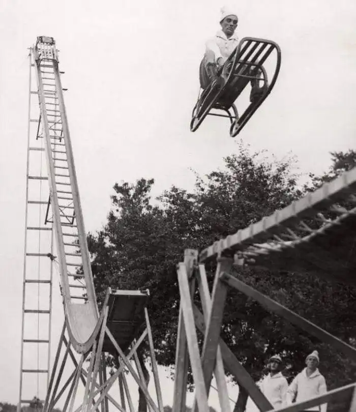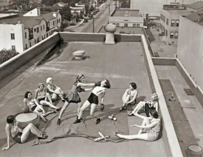 Группа девушек занимается кикбоксингом на крыше многоэтажки, 30-е годы