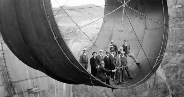 Мужчины стоят на секции стальной трубы для плотины Гувера, строительство которой близится к концу, 1935 год
