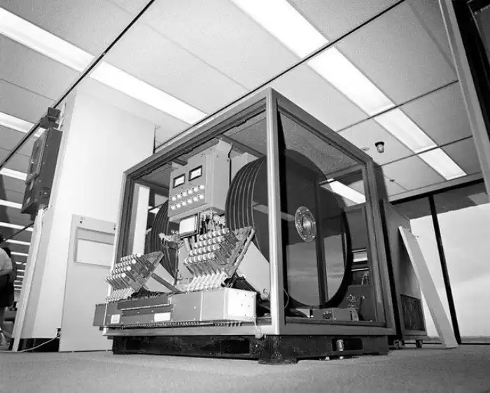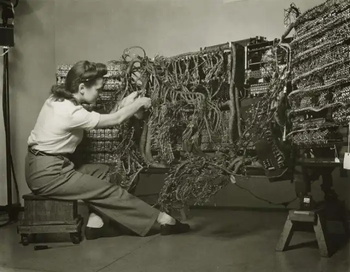 Фотография девушки-инженера, проводящей подключение к одному из первых компьютеров IBM, 1958 год
