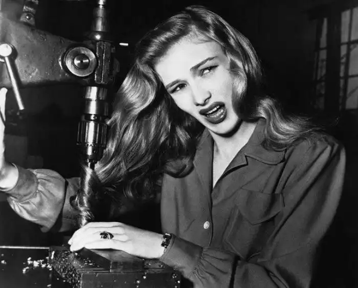 Актриса Вероника Лейк с волосами, закрученными на сверлильном станке, 1943 год