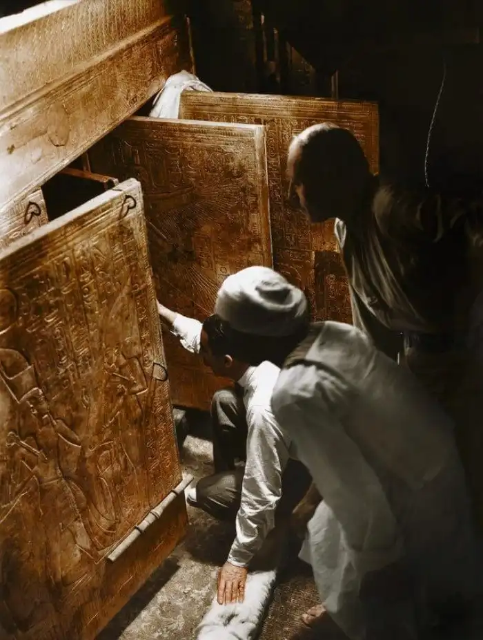 Говард Картер, Артур Каллендер и египетский рабочий впервые видят саркофаг Тутанхамона, 1924 год