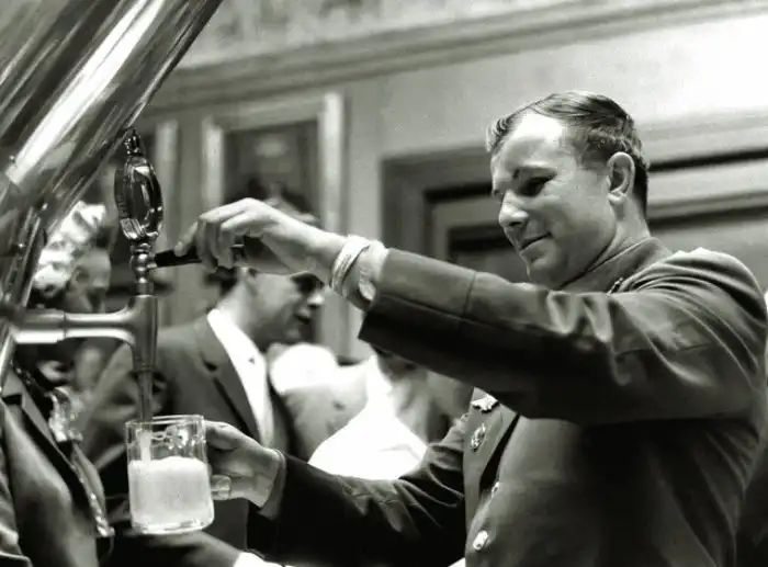 Юрий Гагарин наливает себе кружку пива во время посещения пивоварни Karlsberg в Копенгагене, 1962 год