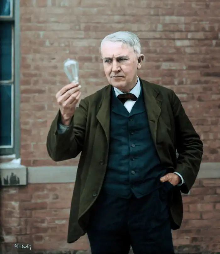 Цветной снимок Томаса Эдисона, который рассматривает своё изобретение — лампочку, 1911 год