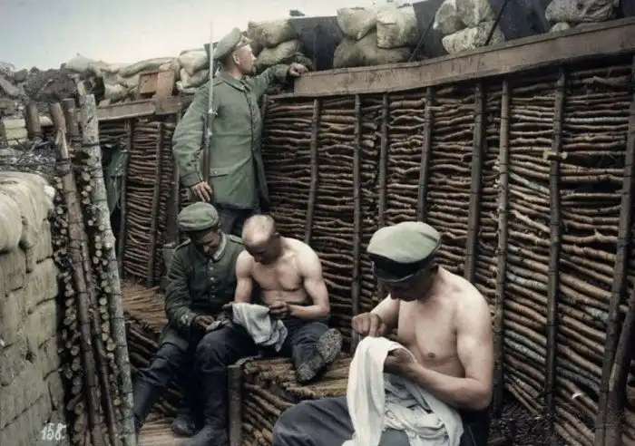 5. Немецкие солдаты в окопе ловят вшей в одежде. Восточный фронт. 1915 год
