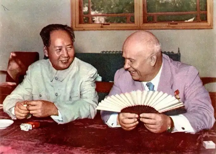 9. Мао Цзэдун и Никита Хрущёв. Во время визита Мао в СССР. 1958 год. Колорированная фотография