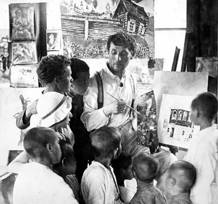 15. Художник Марк Шагал обучает детей в колонии для бездомных детей в Малаховке, Россия, в 1921 году