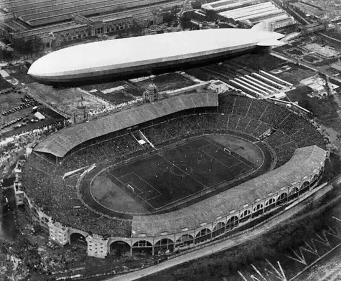 16. Немецкий аэростат Graf Zeppelin пролетает над футбольным стадионом Уэмбли. Лондон, 1930 год