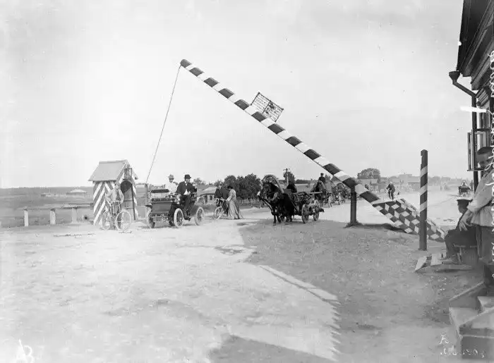 19. Автомобиль у шлагбаума в селе Всяхсвятском на заставе Петербургского тракта в районе нынешней станции метро «Сокол». 1903 год