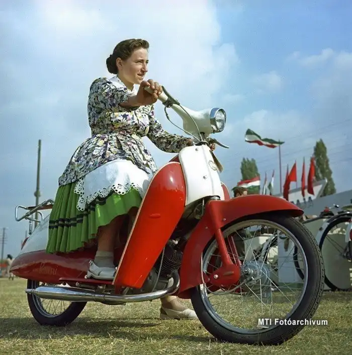 30. Девушка пробует на ярмарке мопед Panni R50, изготовленный велосипедной фабрикой Csepel. Фото MTI Ференц Фервари. 14 октября 1959 год