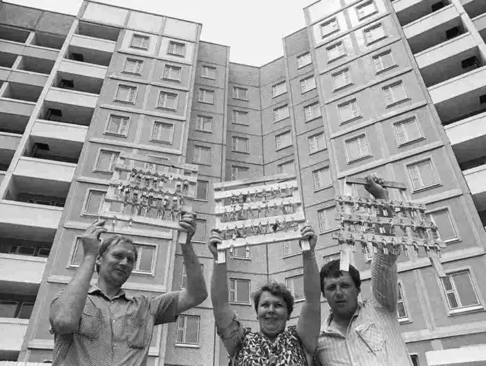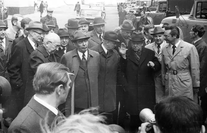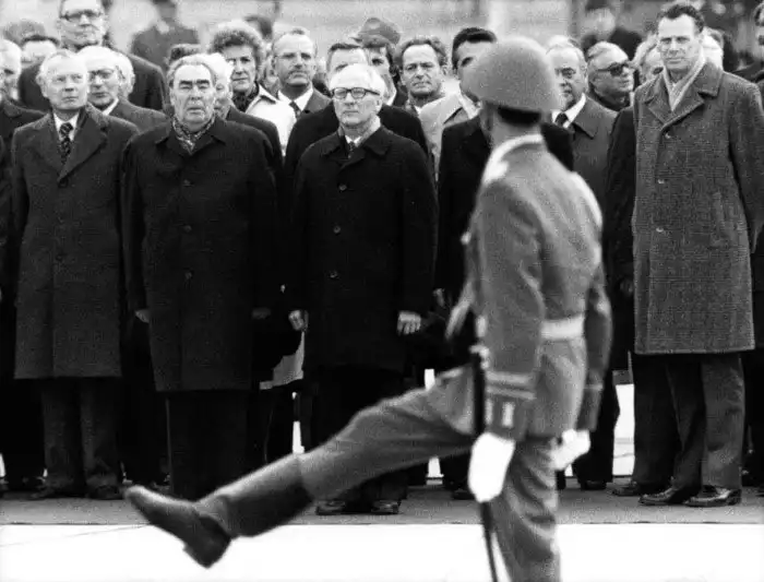 30. Председатель Госсовета ГДР, генеральный секретарь СЕПГ Эрих Хонеккер с генеральным секретарем КПСС Леонидом Брежневым на параде Народной армии в Восточном Берлине, посвященном 30-летию ГДР. 1979 год