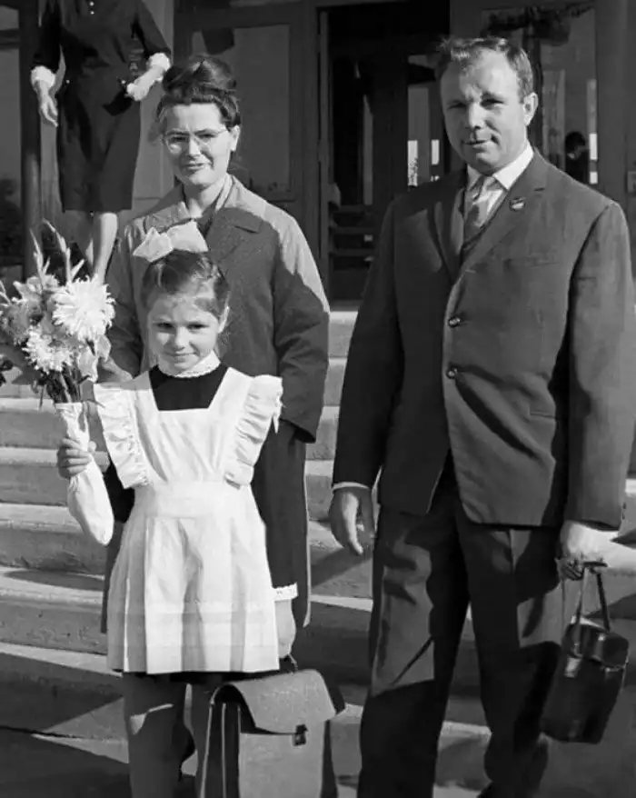 20. Юрий Гагарин с женой с дочкой на 1-е сентября 1966 года. У Юрия Алексеевича в левой руке кинокамера.