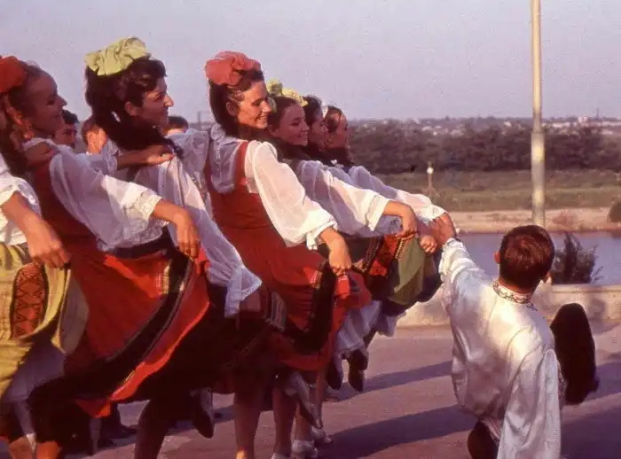 25. Тирасполь. Участники фольклорного ансамбля «Дружба» показывают на берегу Днестра молдавский народный танец. Начало 1970-х