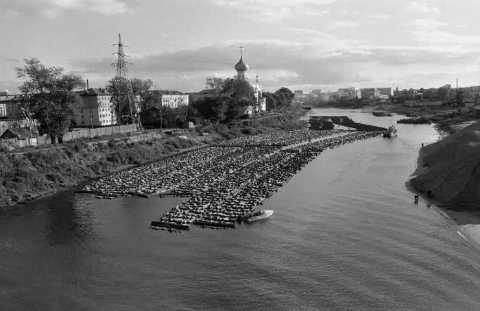 27. Стволы деревьев, связанные друг с другом в виде плотов на реке. Вологда, 1977 год