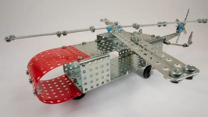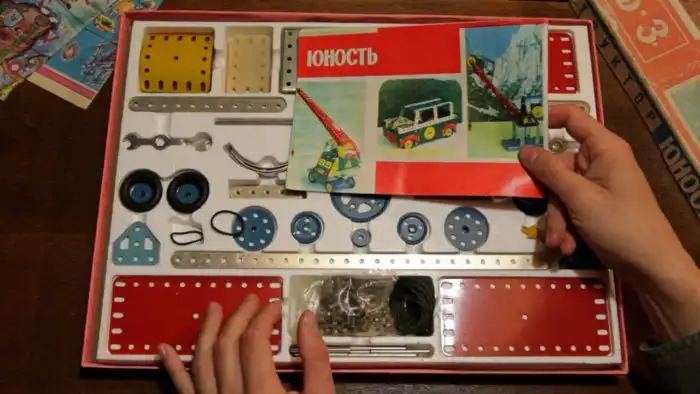 Основа основ и обязательный атрибут в доме каждого советского ребёнка. Уж мальчишки так точно. Как правило, покупали конструктор со множеством металлических деталей, винтиков, шайб и хомутов. Из такого богатства можно было собрать что угодно - от домика до вертолёта.