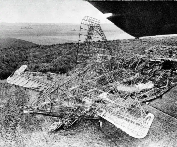 8. Останки дирижабля Р-101 после крушения во время своего первого заграничного рейса. Аллон, Франция, 1930 год