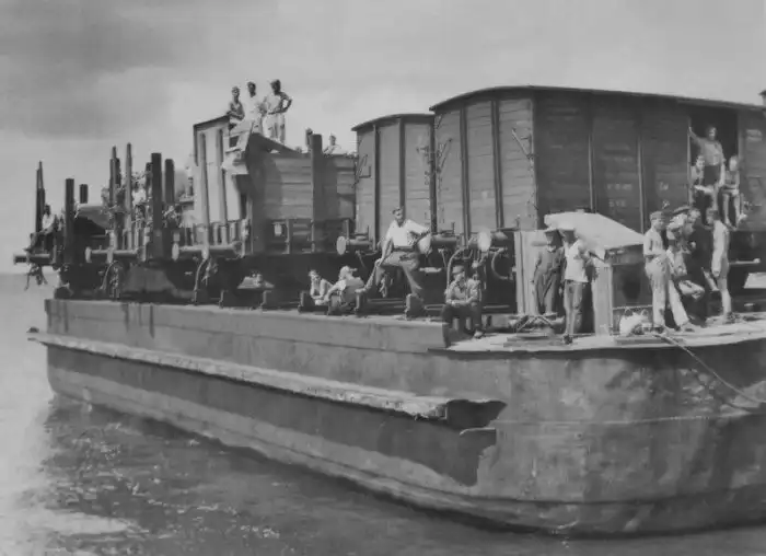 17. Немецкие солдаты в вагонах на пароме Херсонской железнодорожной переправы через Днепр. Херсон, УССР, 1942 год