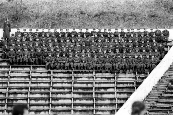 19. Солдаты на стадионе «Торпедо» во время футбольного матча чемпионата России. 1992 год