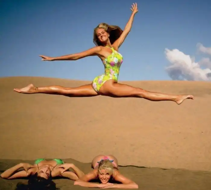 34. Американская супермодель Эшли Ричардсон перепрыгивает через своих коллег, 1992 год