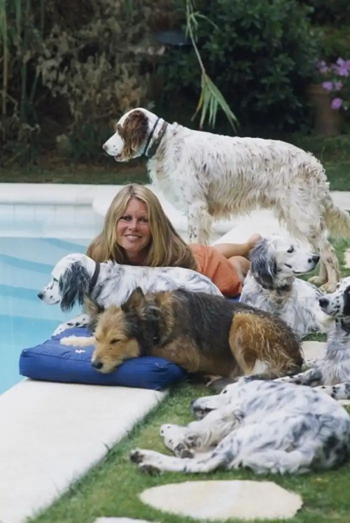 35. Брижит Бардо у бассейна со своими собаками, Сен-Тропе, июль 1980 года. Фотография Джека Гарофало