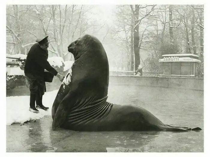 18. Роланд, морской слон весом 1,8 тонны, принимает ванну в Берлинском зоопарке. Фотография 1930 года
