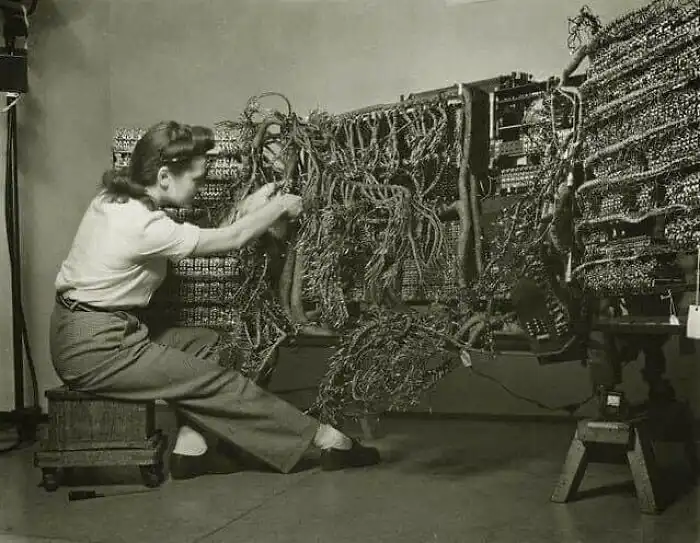 26. Инженер подключает примитивный компьютер IBM, 1958 год