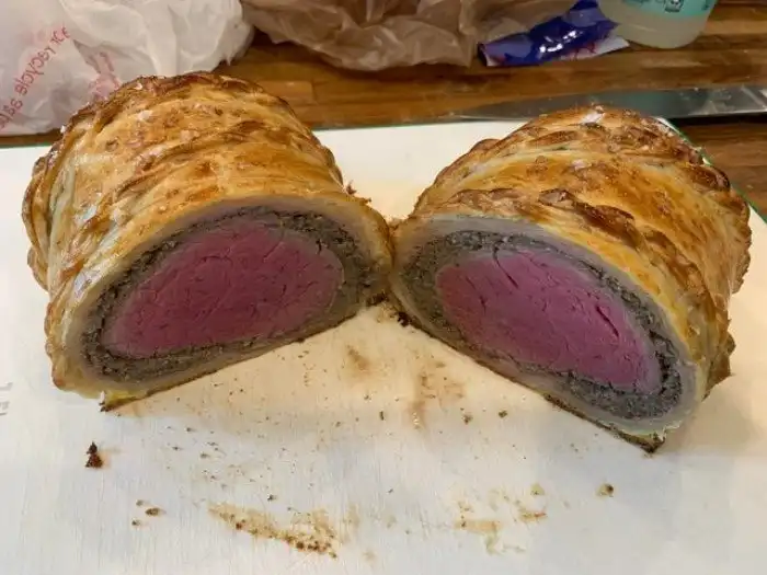 Говядина Веллингтон — классическое праздничное блюдо английского стола. Оно состоит из говяжьей вырезки, запечённой с грибами в слоёном тесте.