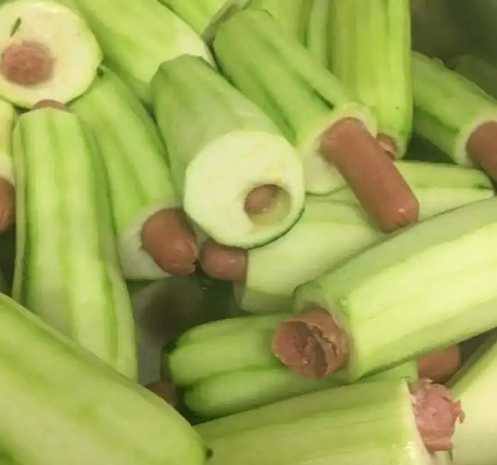 10. "На работе нам готовят еду перед каждой сменой. Знакомьтесь, хот-дог в кабачке"