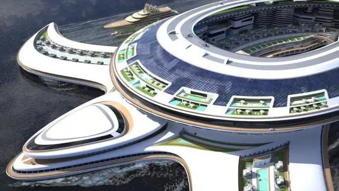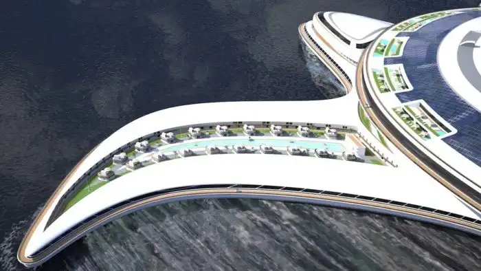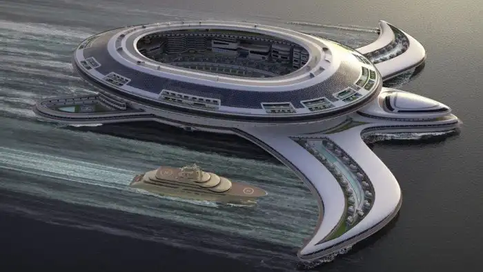 А поскольку Лаззарини хотел бы, чтобы концепция воплотилась в жизнь, дизайнер также учитывает, что для настолько большого сооружения также потребуется верфь, построенная по индивидуальному заказу. Предлагаемая верфь обеспечит прямой доступ к морю и будет включать инфраструктуру плотины, которая позволит тераяхте плавать и выходить в открытое море.Яхта будет оснащена девятью электрическими двигателями мощностью 16 800 лошадиных сил каждый. Во время плавания большие крылья будут получать энергию от торможения волн, что позволяет яхте плыть бесконечно. Это также означает отсутствие грязных выбросов в море. Крыша с солнечными панелями восполнит потребности города в электричестве за счет экологически чистой энергии.