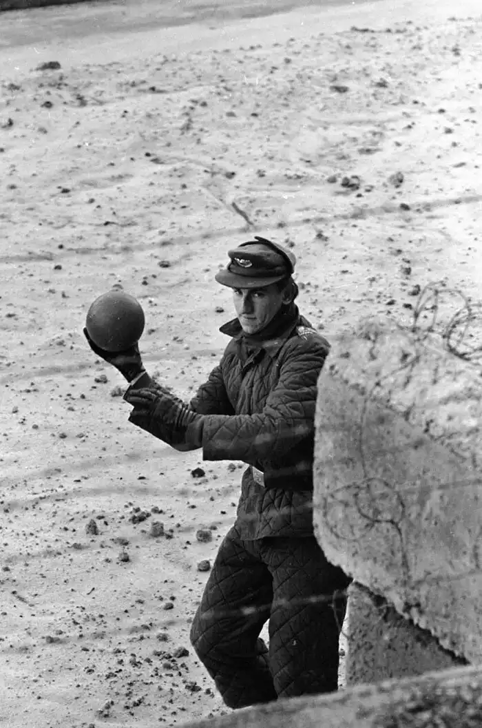 10. Солдат из Восточной Германии бросает мяч ребенку, играющему на западногерманской стороне Берлинской стены. 1962 г.
