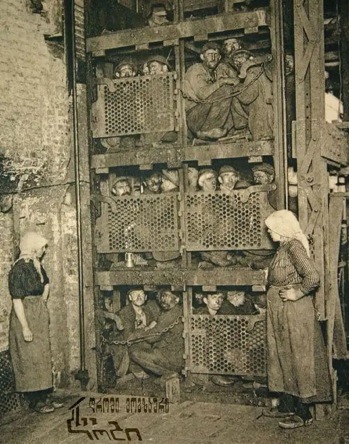 18. Бельгийские шахтеры поднимаются из шахты после рабочего дня, 1900 год