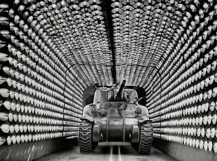 30. Свежеокрашенный танк M4 Sherman в туннеле с инфракрасной лампой, предназначенном для сокращения времени высыхания краски с 24 часов до 4 минут