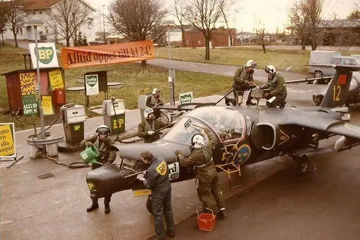 35. Шведские пилоты заправляют Saab 105 на автозаправке, 1980 год