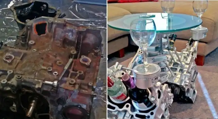 У любителей техники в гараже чего только не найдешь! Пользователь соцсетей нашел там целый двигатель, который уже явно не мог работать по прямому назначению, и превратил его в кофейный столик! То, что было, и что стало, он показал пользователям интернета.