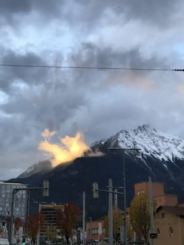 Солнечный свет попал на облако, и это выглядит так, будто гора горит
