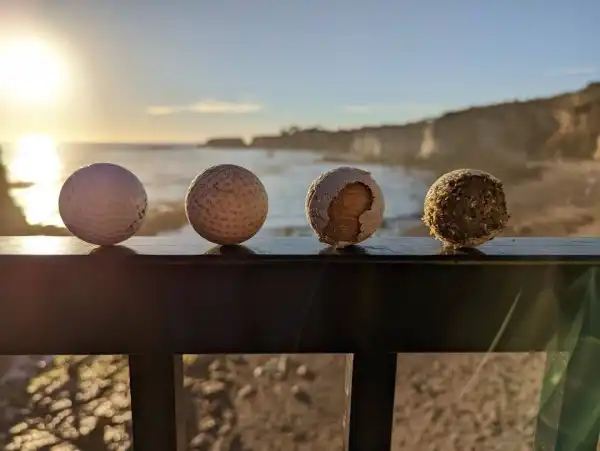 Я нашел четыре мяча для гольфа в разной степени разложения в пределах метра друг от друга на пляже