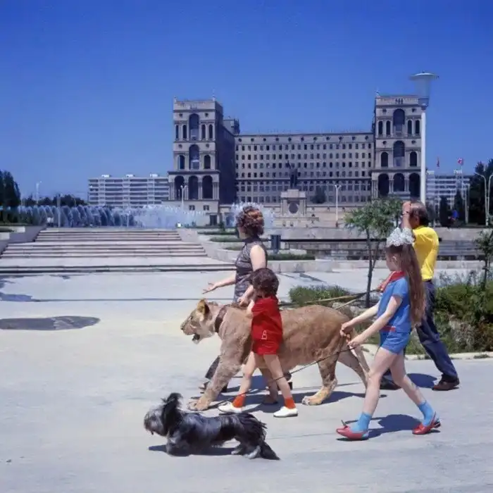 16. Семья Берберовых выгуливают одного из своих домашних львов Кинга II. Баку, Азербайджанская ССР, 1974 год