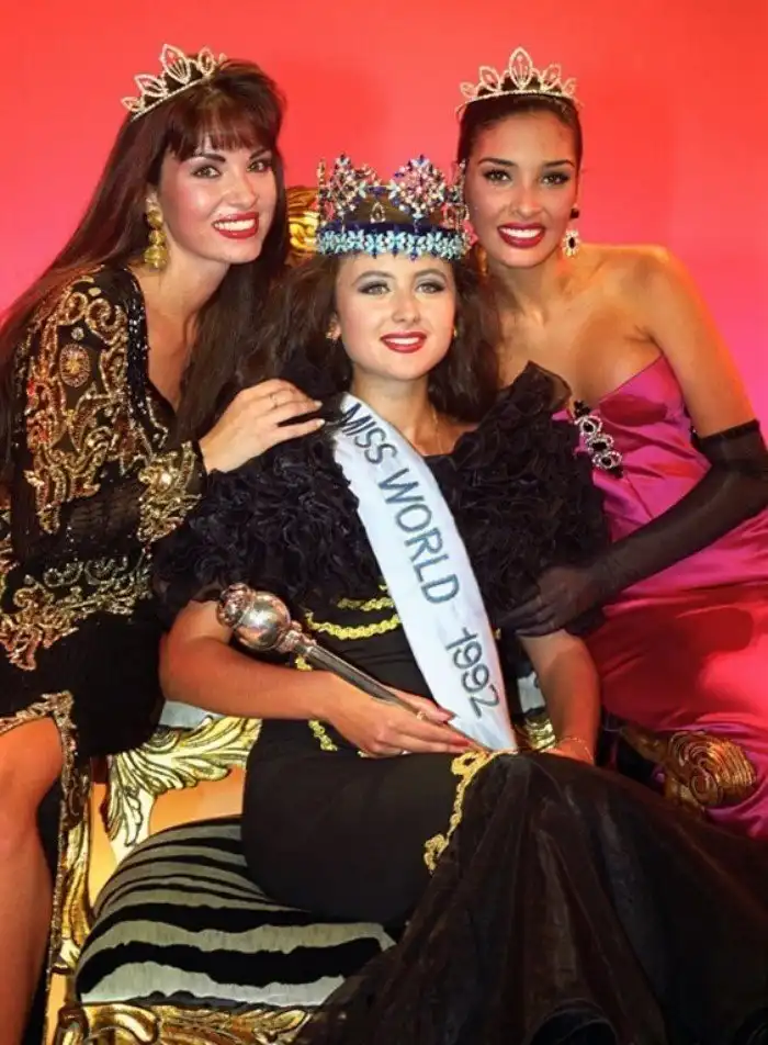 24. «Мисс мира – 1992» 18-летняя Юлия Курочкина сидит в центре рядом с Клэр Смит «Мисс Великобритания» и Фрэнсис Гаго «Мисс Венесуэла», 12 декабря 1992 год