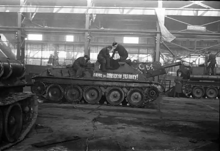 25. Производство САУ СУ-122 в сборочном цехе Уралмашзавода. На самоходке надпись: «Вперед за советскую Украину». г. Свердловск, 1943 год