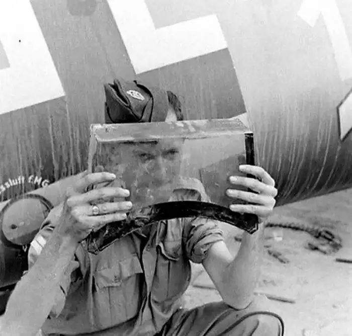 27. Британский авиатехник демонстрирует толщину лобового бронестекла "Мессершмитт" Bf 109Е. Вторая мировая