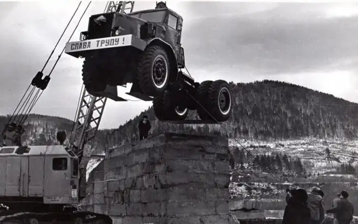 26. Стройные колонны «КрАЗов» с песком, которыми испытывали мост. СССР