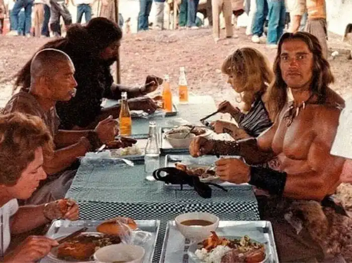 5. Арни и актёры съёмочной группы за обедом на съёмках "Конан-разрушитель". 1984 год