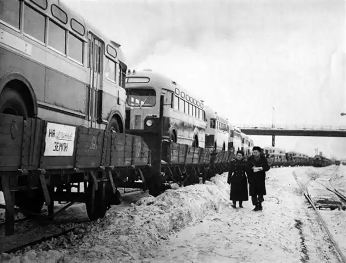 31. Отправка автобусов ЗИС–155 на целинные земли, 1950–е годы, СССР
