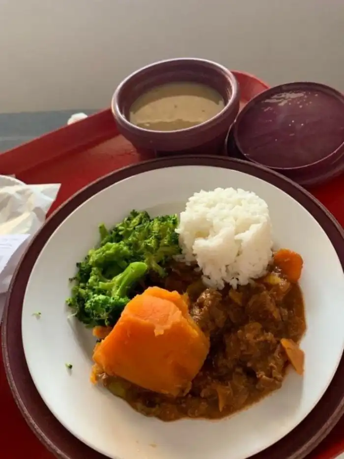 Обед из тушёной говядины, риса, сладкого картофеля и брокколи, а также крем-суп из куриного филе.