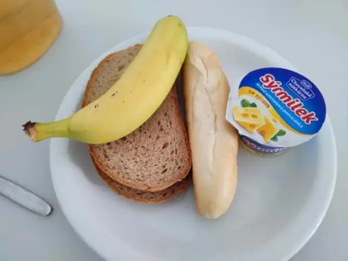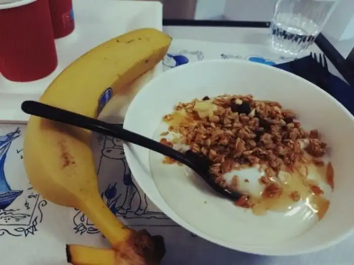 Завтрак из мюсли и йогурта с бананом и чаем, 8/10.