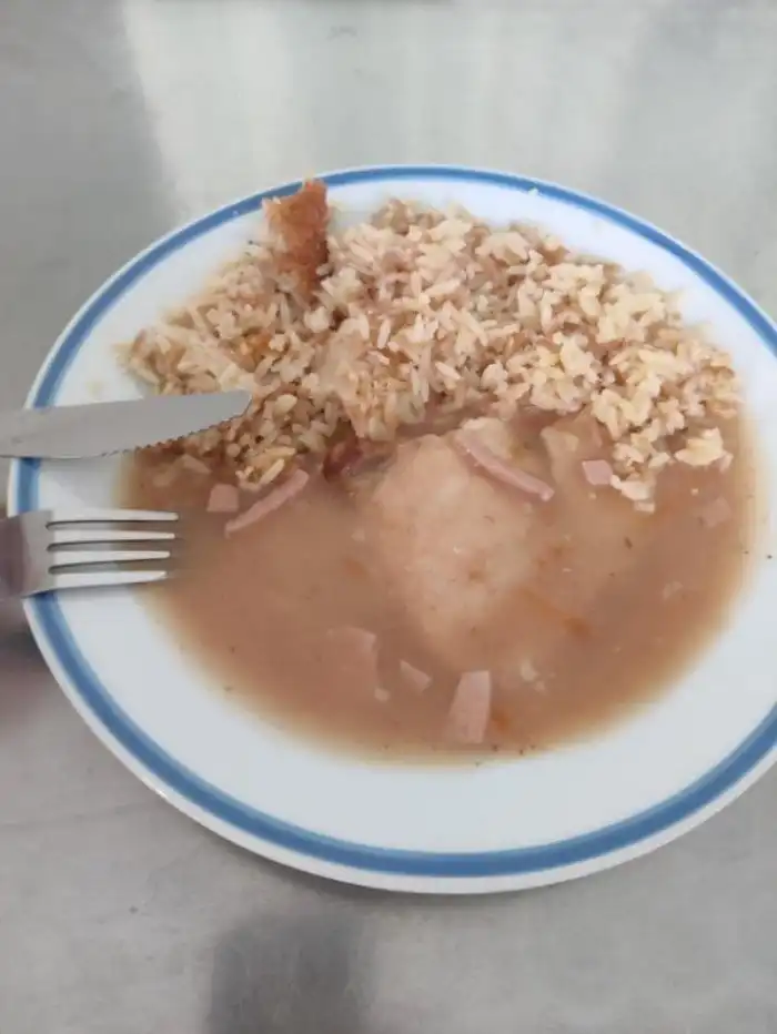 Это обед в отделении интенсивной терапии города Пьештяны. Неопознанный соус со свиным кусочком и макароны в форме риса. Да, это точно макароны.